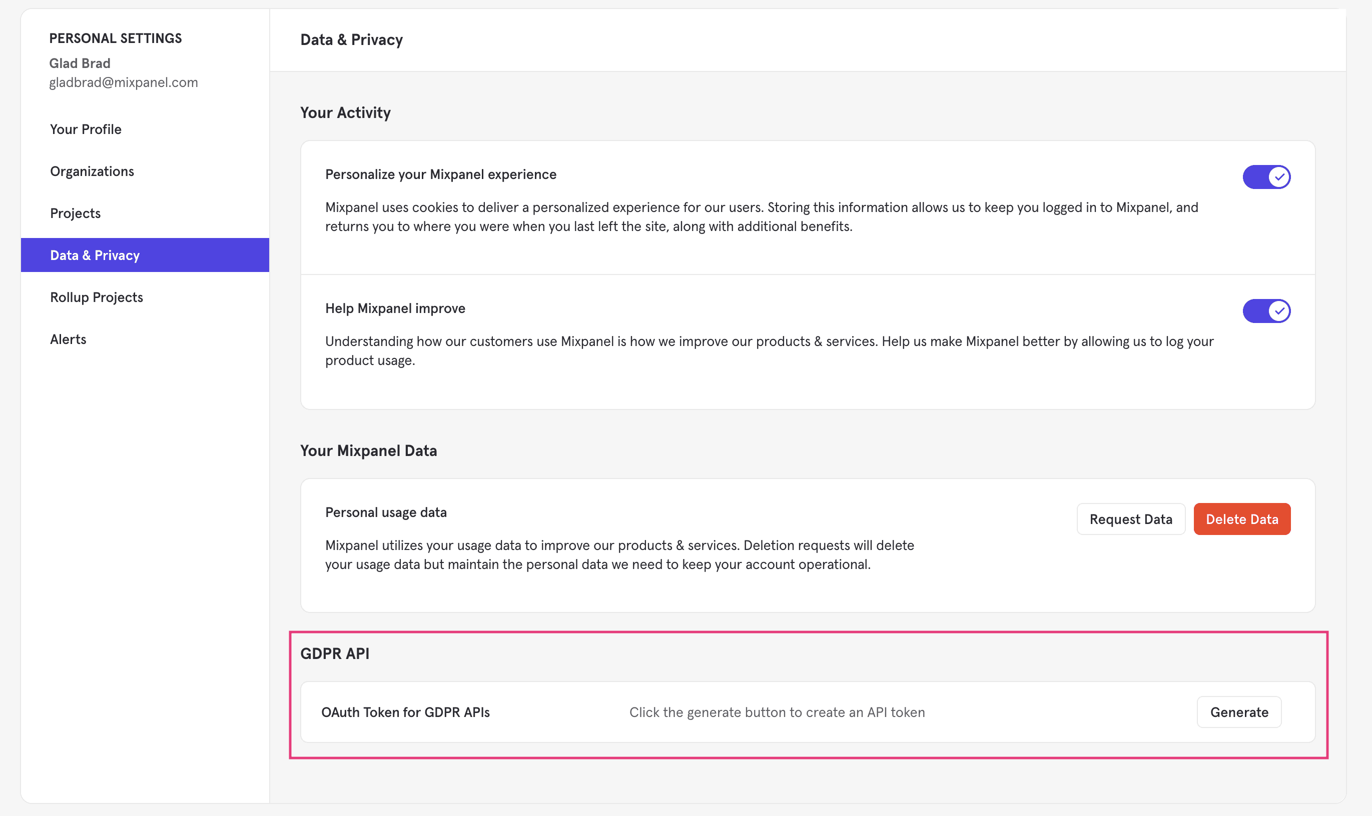 In order to submit a request, you must first generate a GDPR OAuth token from your Personal Settings. This token is required for requests submitted both through the Mixpanel interface and through Mixpanel's APIs. Users can retrieve this token from their Account Settings (opens in a new tab) by selecting their initials in the top right of Mixpanel and selecting Profile & Preferences, and then the Data & Privacy tab. The OAuth token has a one year expiry. For requests submitted via API, the token should be passed in the Authentication header. Users are eligible to generate an OAuth token if they are the Project Owner, or if they are a Project Owner or Admin of a project that supports team member roles.